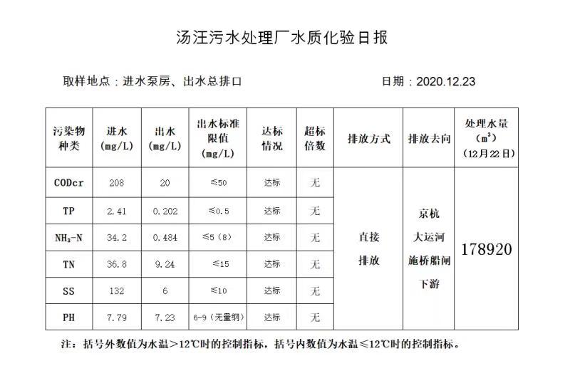 汤汪污水处理厂水质化验日报(2020.12.23)