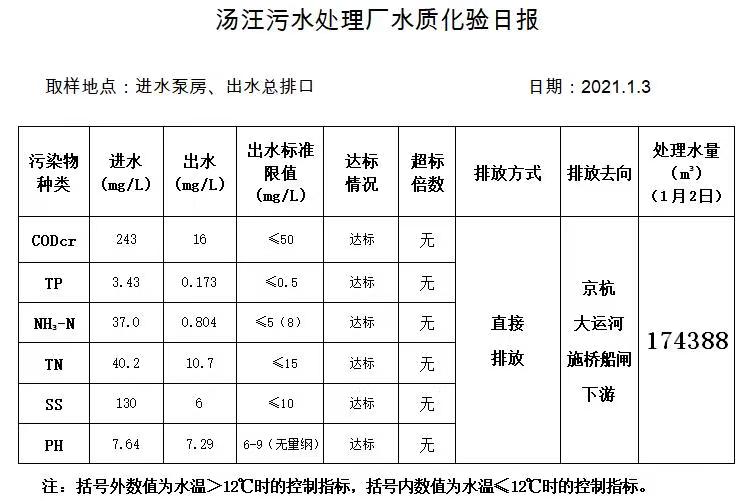 汤汪污水处理厂水质化验日报(2021.1.3)