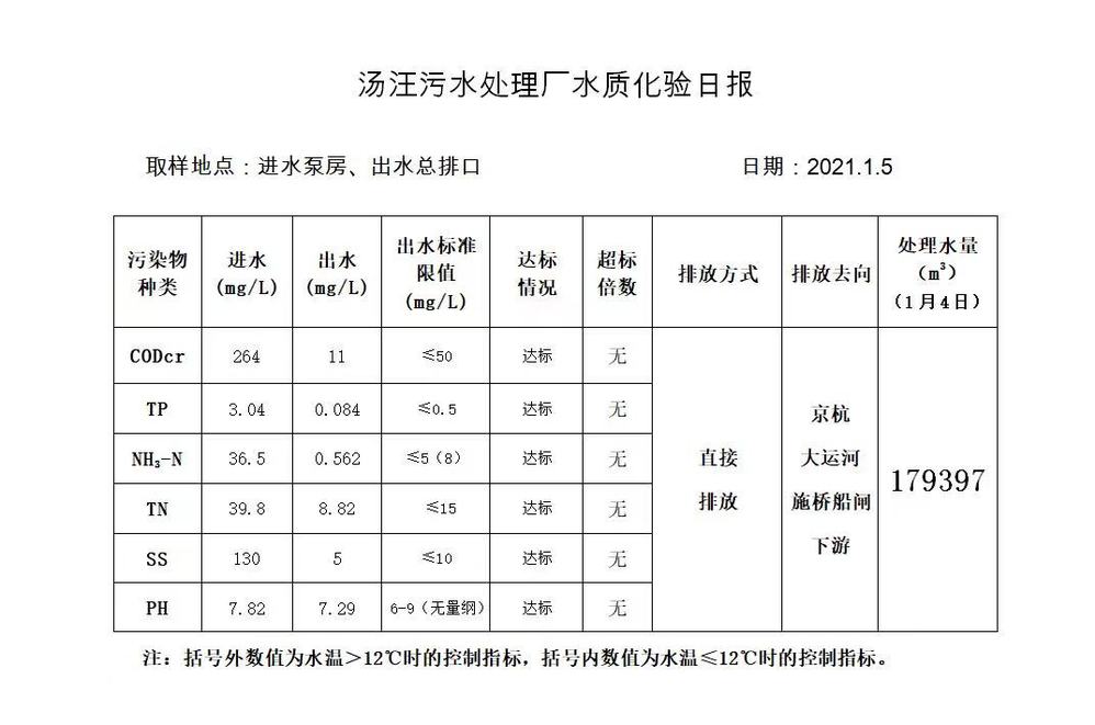 汤汪污水处理厂水质化验日报(2021.1.5)