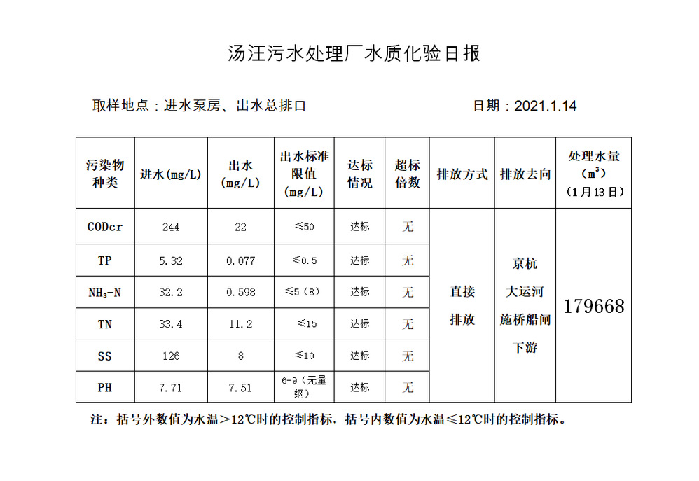 汤汪污水处理厂水质化验日报(2021.1.14)