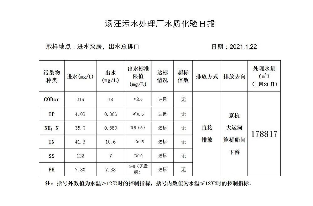 汤汪污水处理厂水质化验日报(2021.1.22)