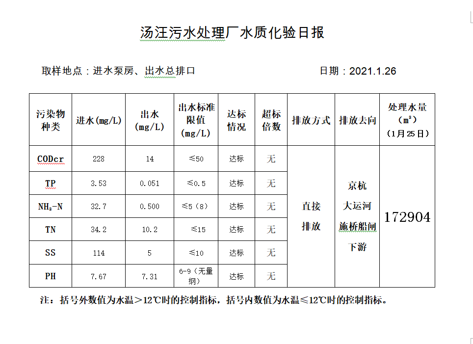 汤汪污水处理厂水质化验日报(2021.1.26)