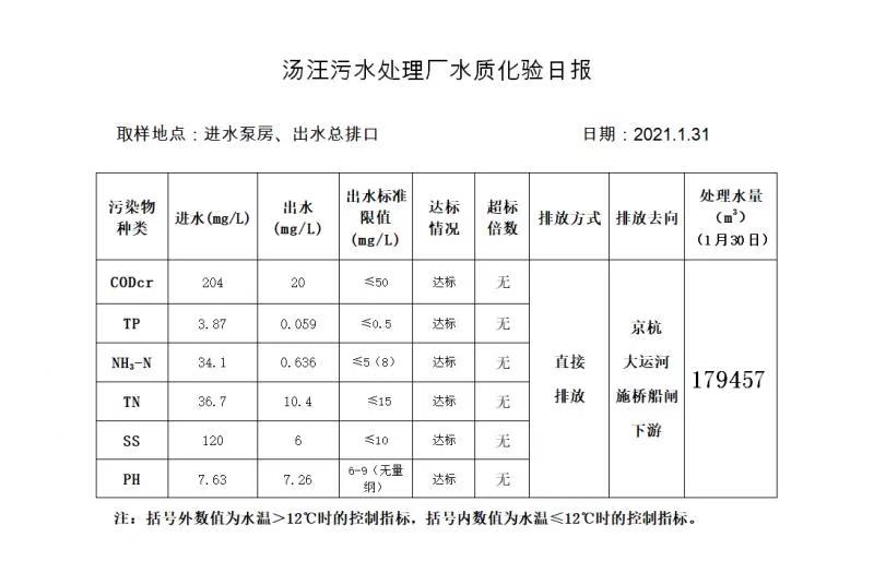 汤汪污水处理厂水质化验日报(2021.1.31)