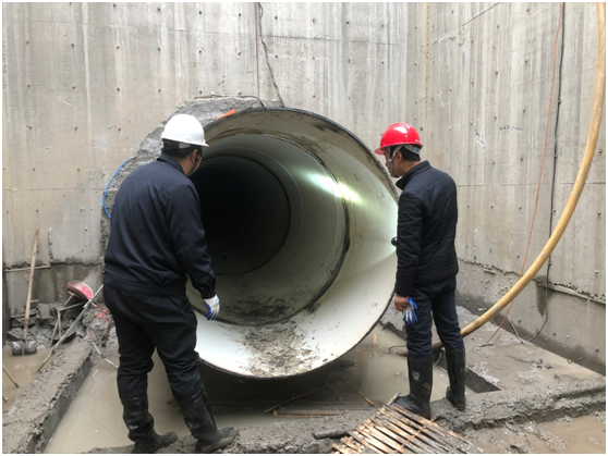 目前,汤汪污水处理厂三期尾水管道工程完成了9座沉井及2122米的管道施工,已完成整个工程量的50%,尤其是东风河路顶管段施工,项目部在专家论证会的基础上,克服地下管线复杂、顶管长度长等施工不利因素,最终顺利地完成该段顶管工程。