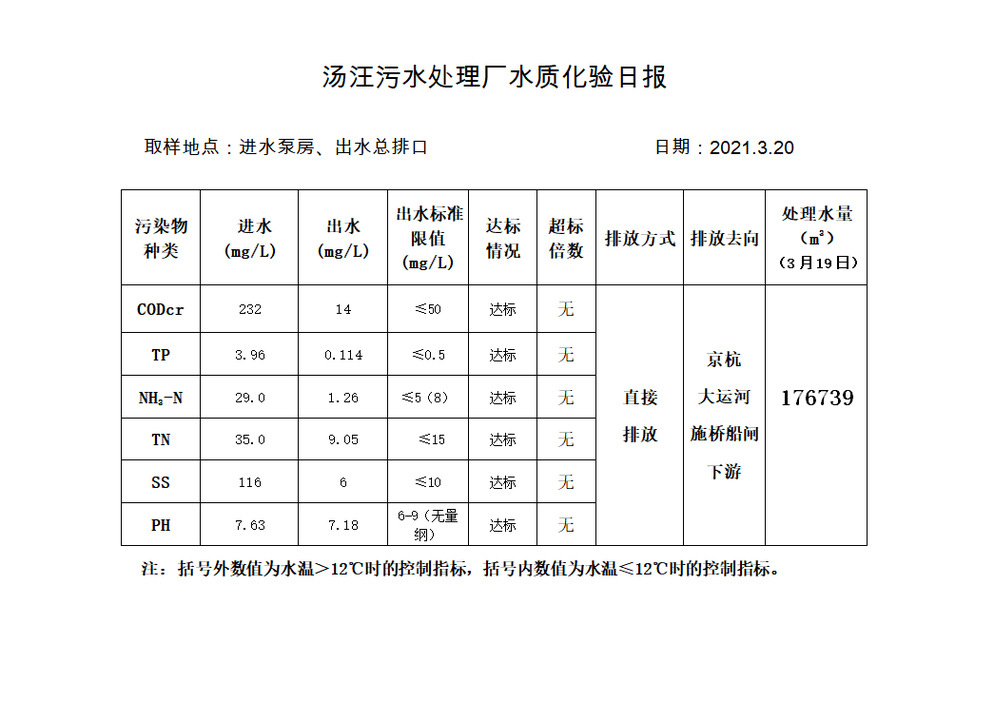 汤汪污水处理厂水质化验日报(2021.3.20)