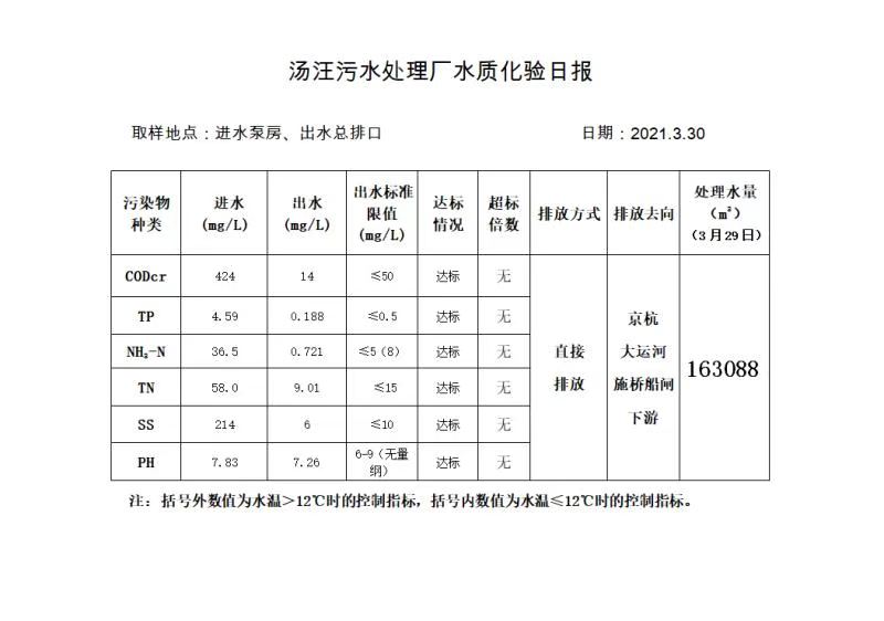 汤汪污水处理厂水质化验日报(2021.3.30)