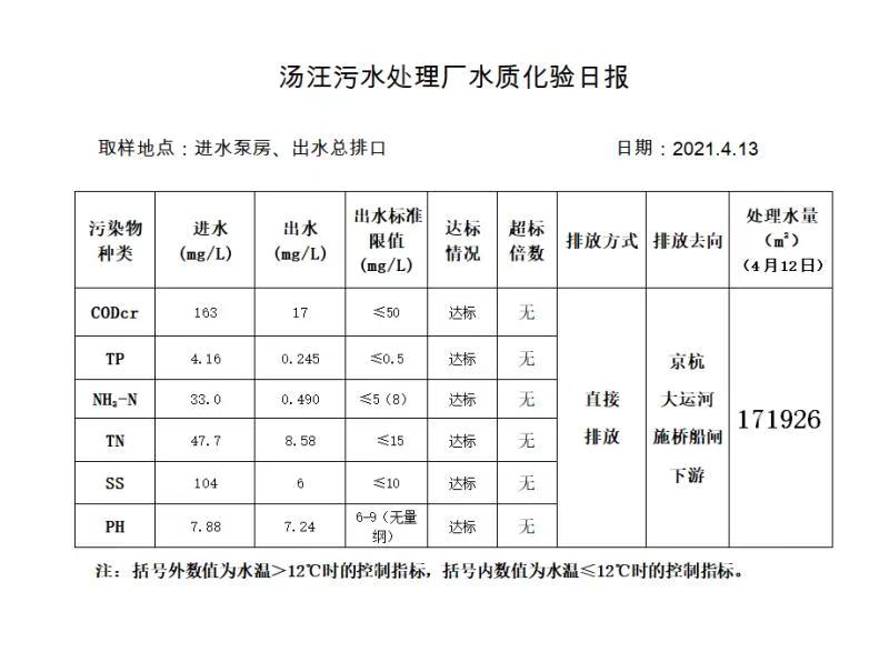 汤汪污水处理厂水质化验日报(2021.4.13)