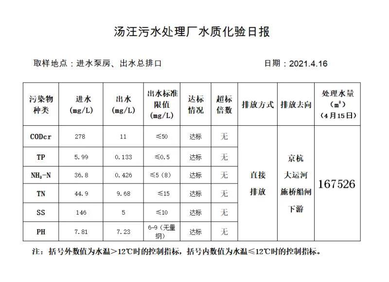 汤汪污水处理厂水质化验日报(2021.4.16)