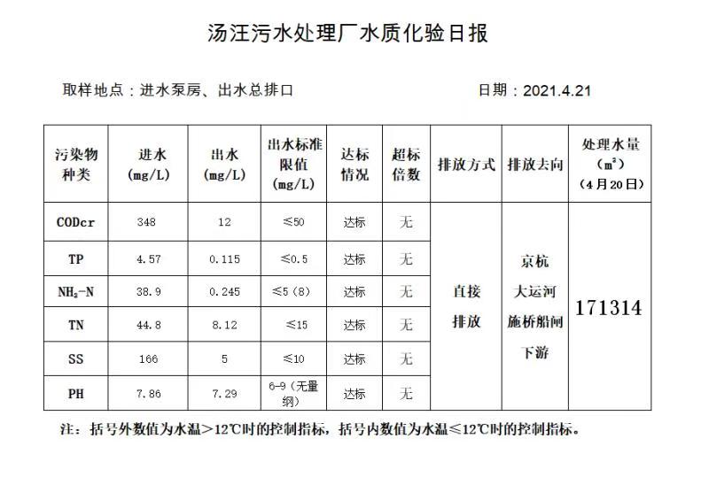 汤汪污水处理厂水质化验日报(2021.4.21)
