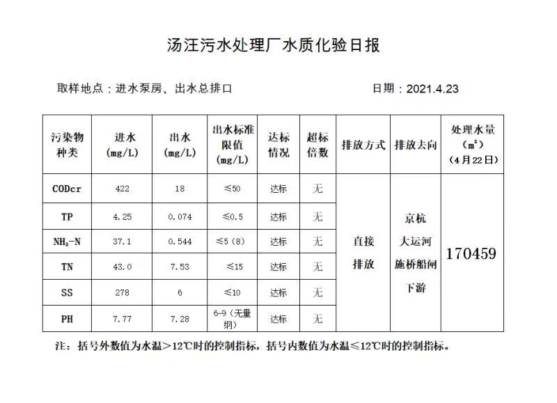 汤汪污水处理厂水质化验日报(2021.4.23)