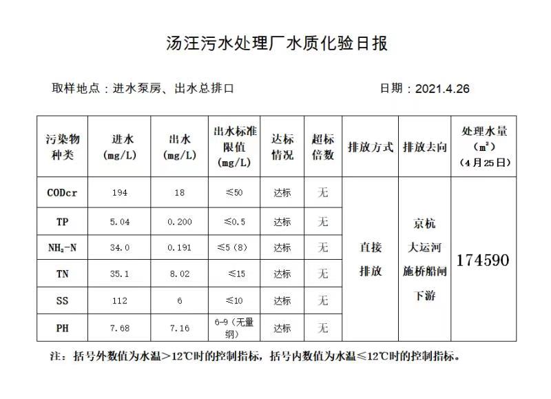 汤汪污水处理厂水质化验日报(2021.4.26)