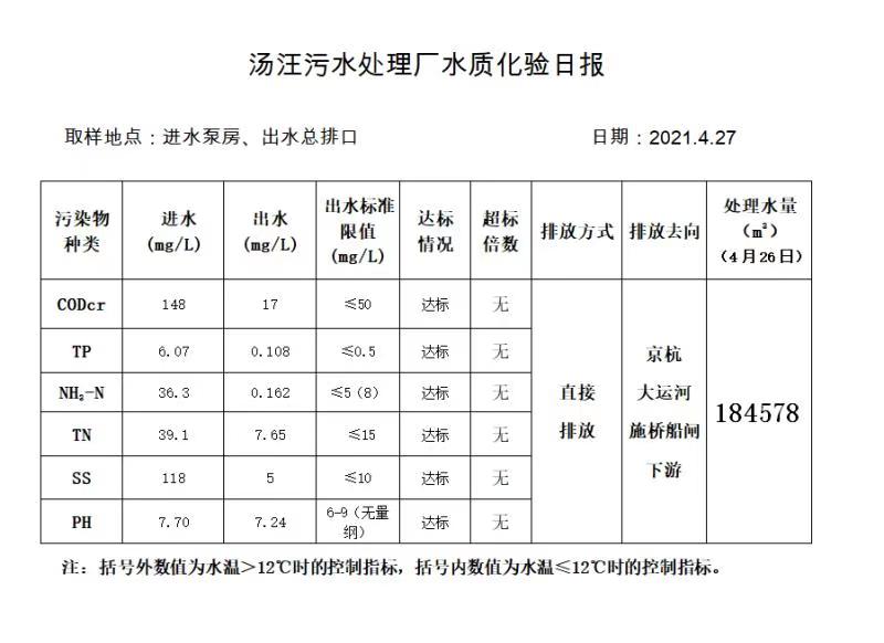 汤汪污水处理厂水质化验日报(2021.4.27)
