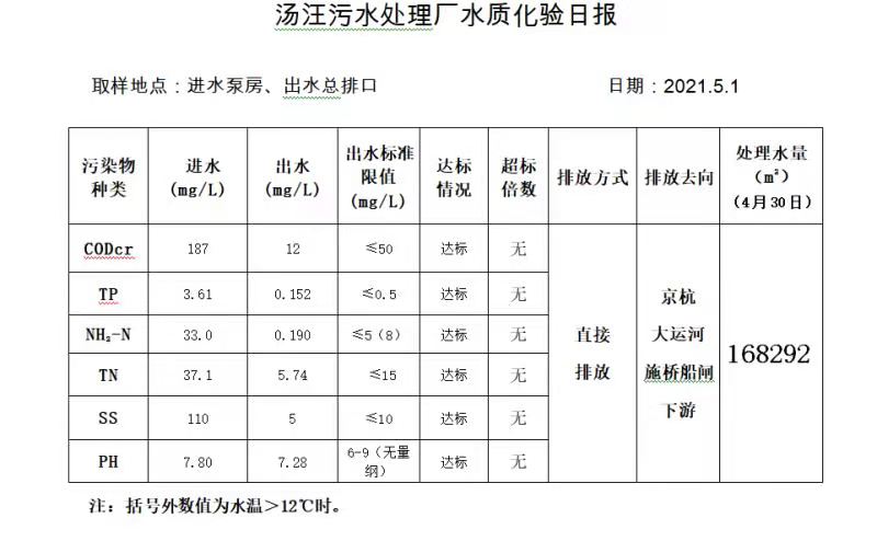 汤汪污水处理厂水质化验日报(2021.5.1)