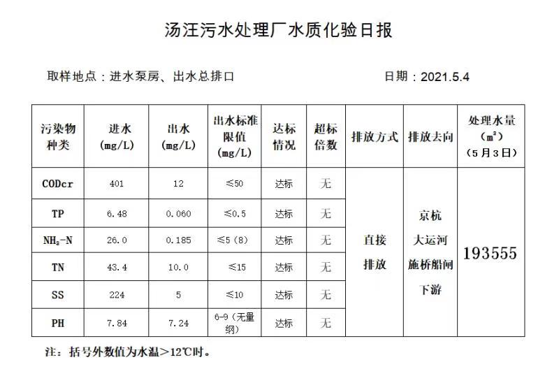 汤汪污水处理厂水质化验日报(2021.5.4)
