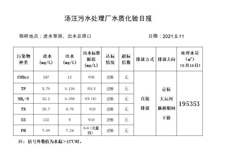 汤汪污水处理厂水质化验日报(2021.5.11)