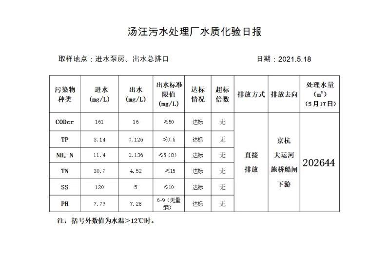 汤汪污水处理厂水质化验日报(2021.5.18)