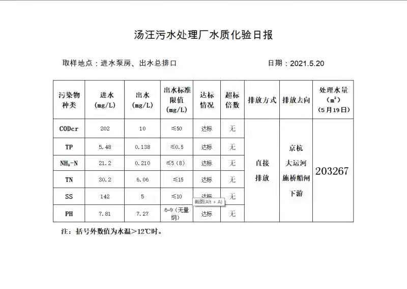 汤汪污水处理厂水质化验日报(2021.5.20)