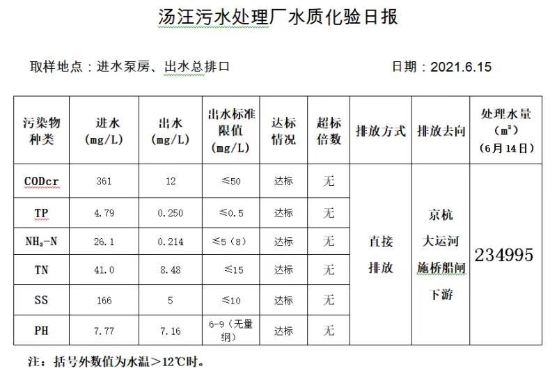 汤汪污水处理厂水质化验日报(2021.6.15)
