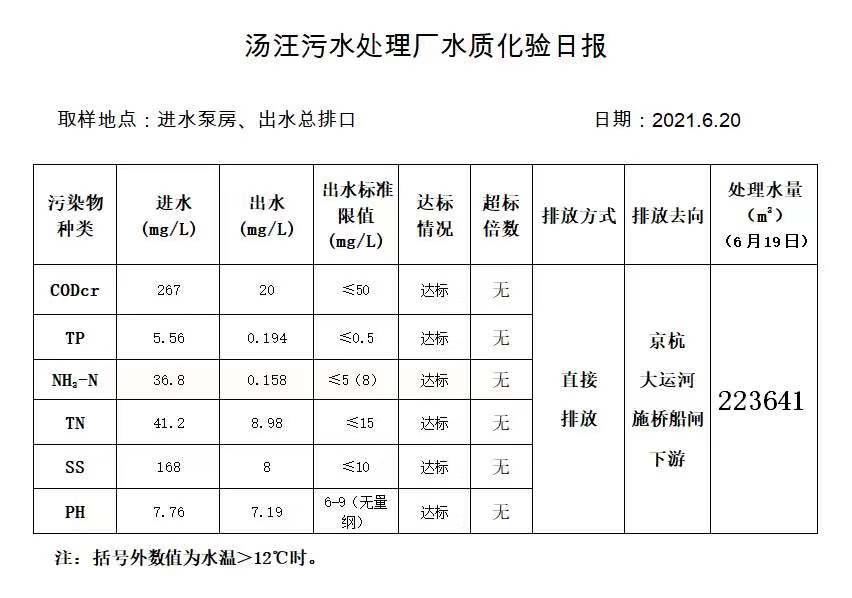汤汪污水处理厂水质化验日报(2021.6.20)