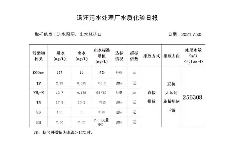汤汪污水处理厂水质化验日报(2021.7.30)