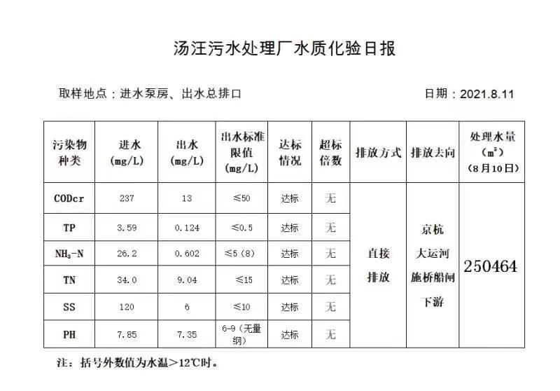 汤汪污水处理厂水质化验日报(2021.8.11)