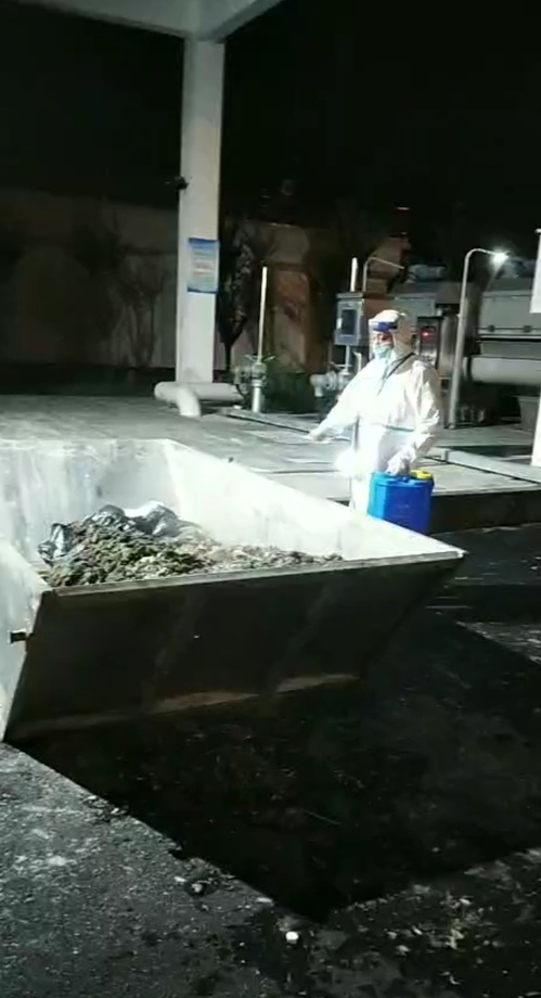 4、创新防控举措,强化关键环节消杀。为全面做好污水处理厂疫情防控的“内防输出”工作,汤汪、六圩两座污水处理厂安排专人重点对粗细格栅出渣口、污泥处置设施等进行多频次消杀,防止病毒传播。同时,开拓疫情防控思路,在两厂的脱水机房创新性的安装配置次氯酸钠的消毒设施,该装置在每台脱水机的出泥口匀速投加10%的次氯酸钠溶液,对脱水污泥进行消毒处理,确保病毒不通过脱水污泥传播,该装置在省内污水处理厂尚属首次应用,效果良好。