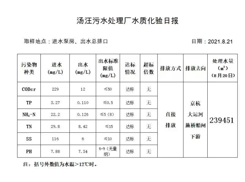 汤汪污水处理厂水质化验日报(2021.8.21)