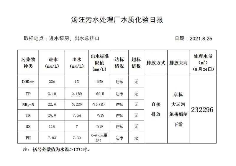汤汪污水处理厂水质化验日报(2021.8.25)