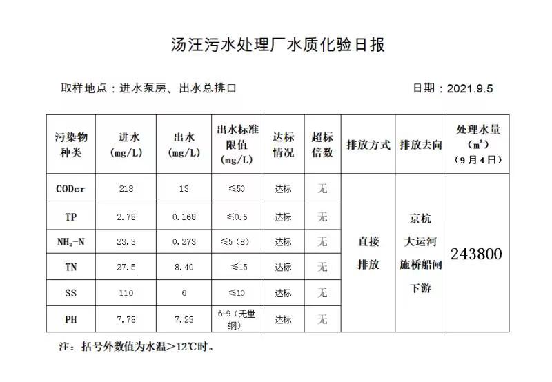 汤汪污水处理厂水质化验日报(2021.9.5)