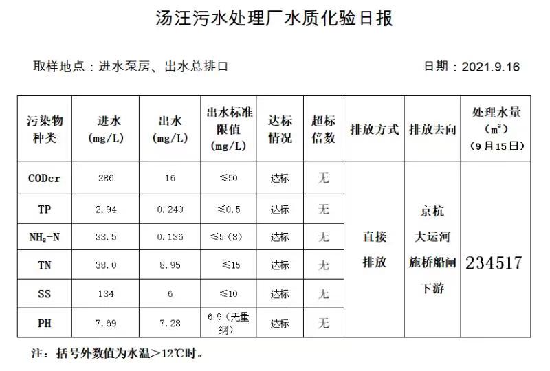 汤汪污水处理厂水质化验日报(2021.9.16)