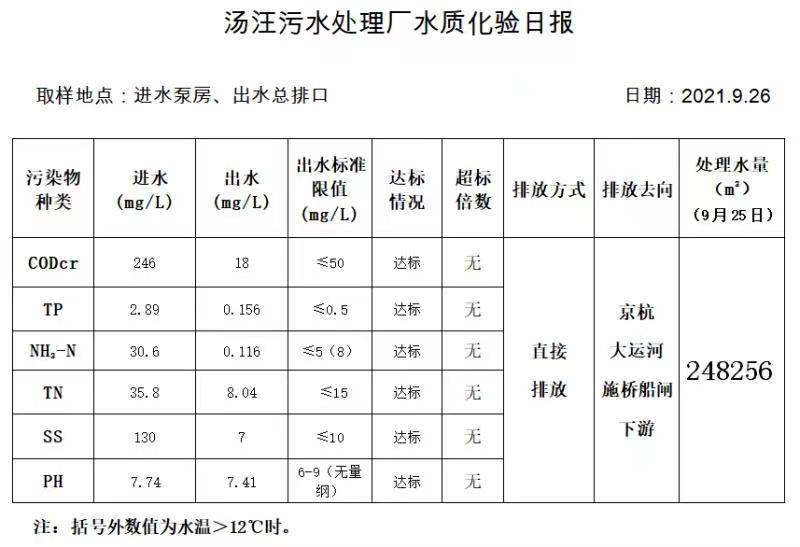 汤汪污水处理厂水质化验日报(2021.9.26)