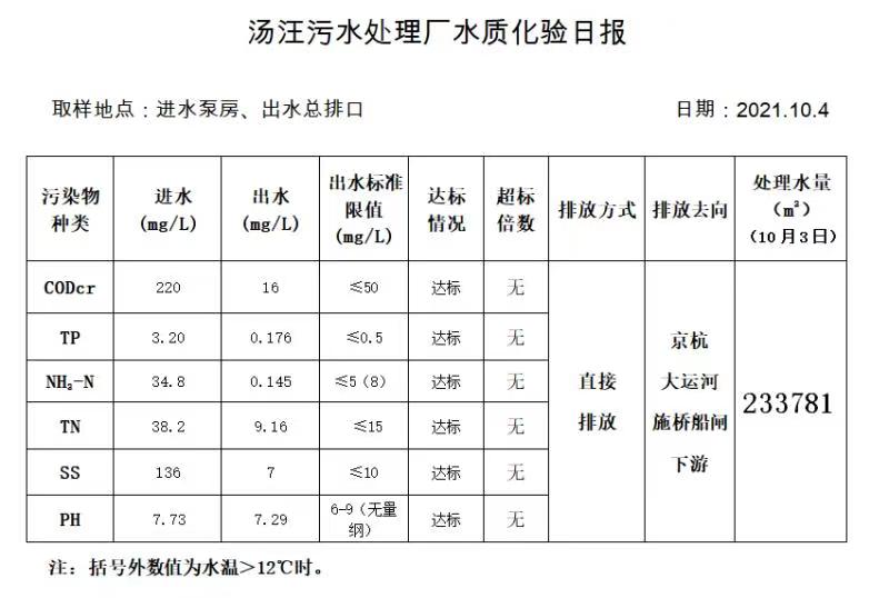 汤汪污水处理厂水质化验日报(2021.10.4)