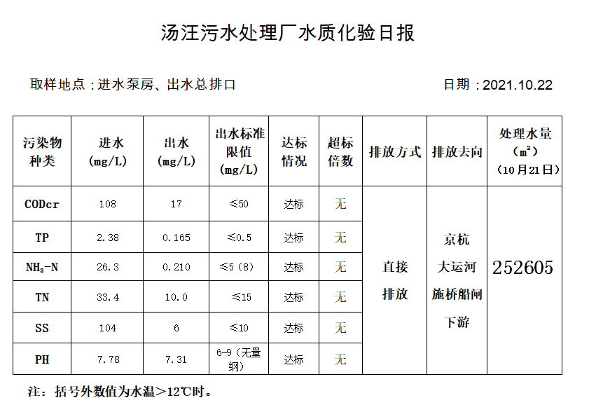 汤汪污水处理厂水质化验日报(2021.10.22)