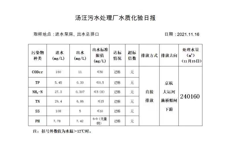 汤汪污水处理厂水质化验日报(2021.11.16)