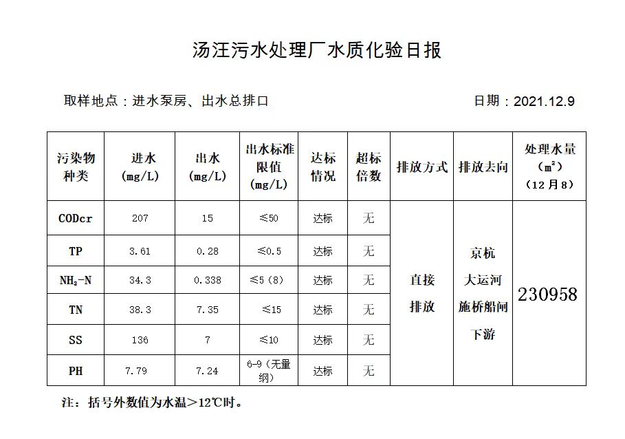 汤汪污水处理厂水质化验日报(2021.12.9)
