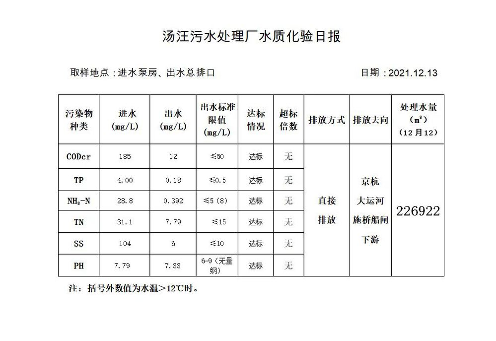 汤汪污水处理厂水质化验日报(2021.12.13)