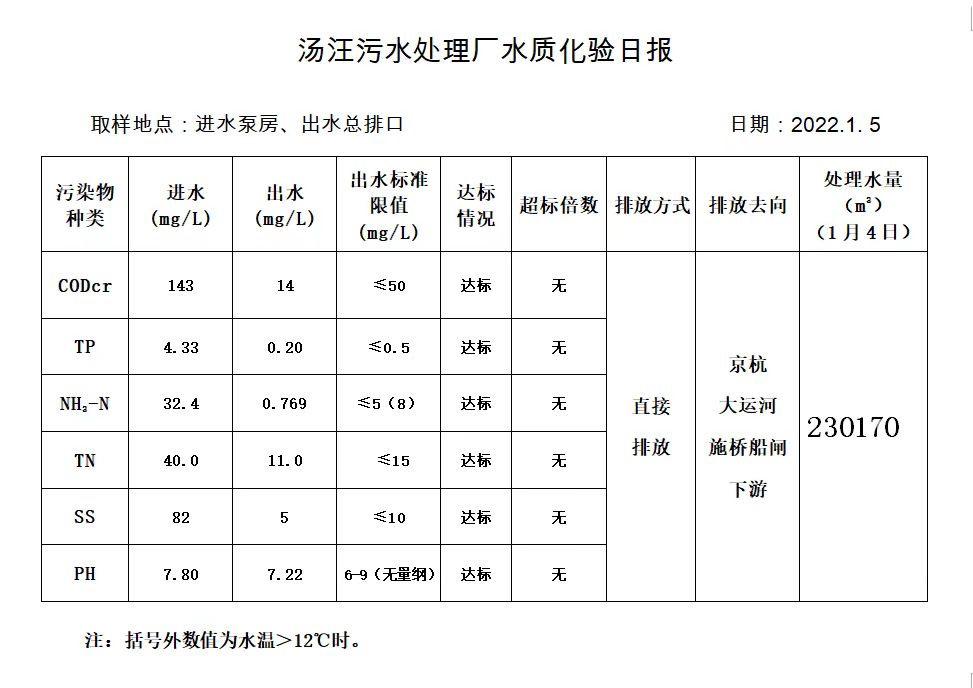 汤汪污水处理厂水质化验日报(2022.1.5)