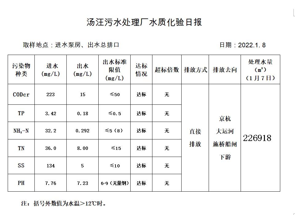 汤汪污水处理厂水质化验日报(2022.1.8)