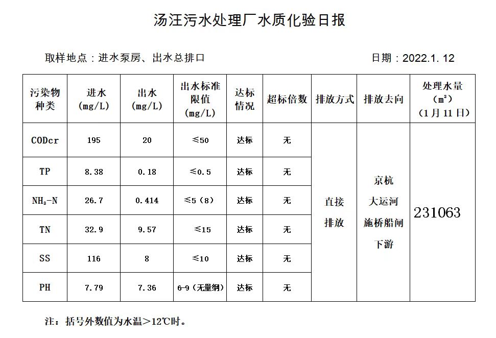 汤汪污水处理厂水质化验日报(2022.1.12)