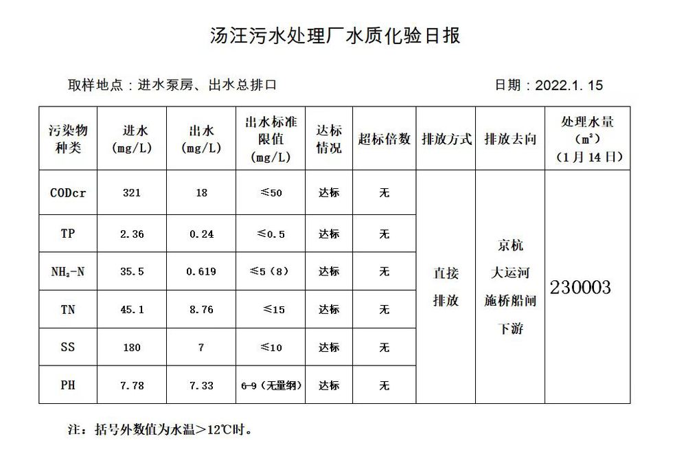汤汪污水处理厂水质化验日报(2022.1.15)