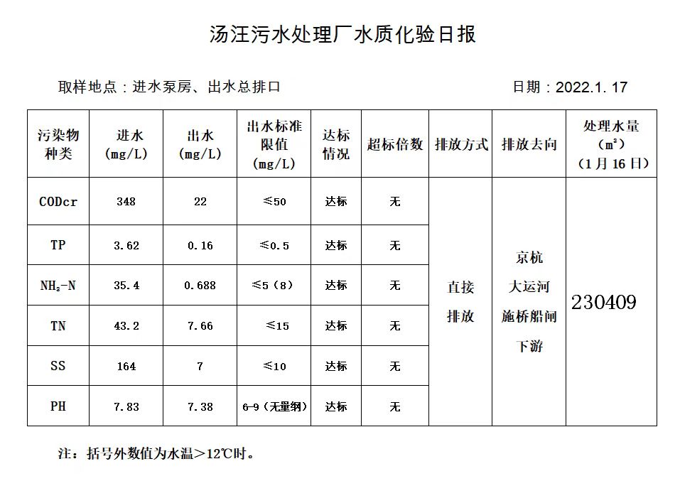 汤汪污水处理厂水质化验日报(2022.1.17)