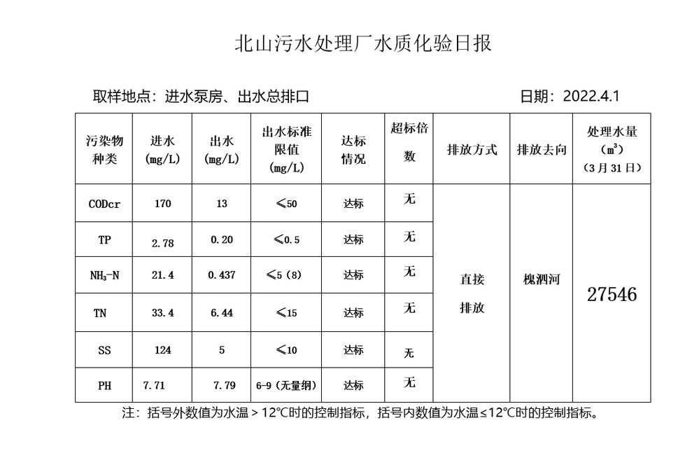 北山污水处理厂水质化验日报(2022.4.1)