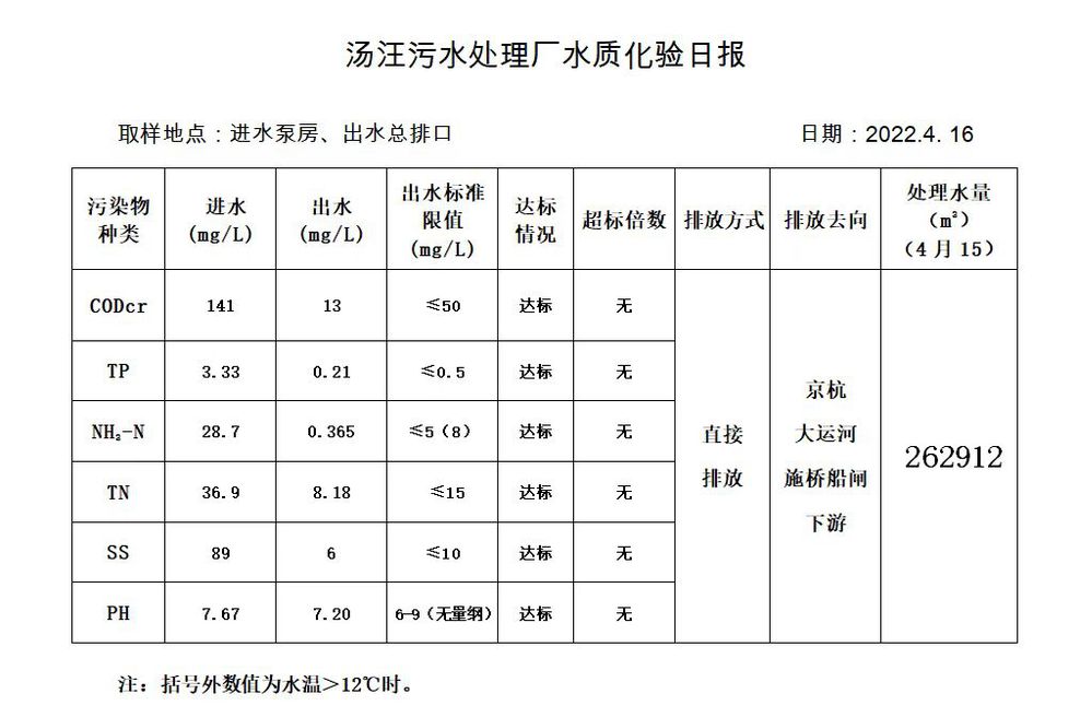 汤汪污水处理厂水质化验日报(2022.4.16)