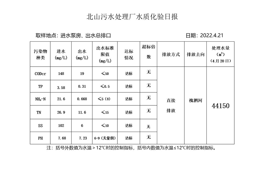 北山污水处理厂水质化验日报(2022.4.21)