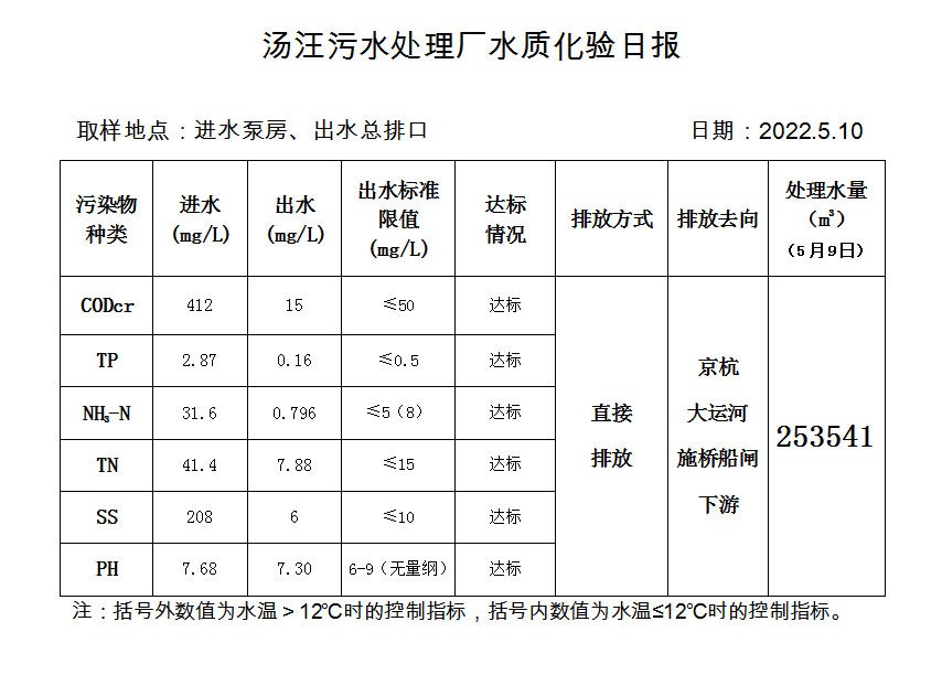 汤汪污水处理厂水质化验日报(2022.5.10)
