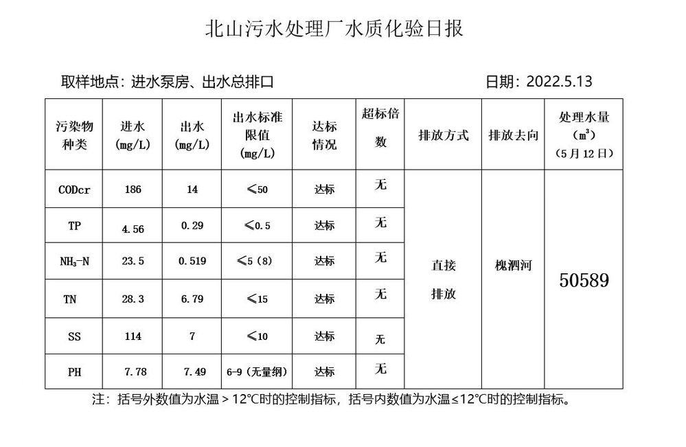 北山污水处理厂水质化验日报(2022.5.13)