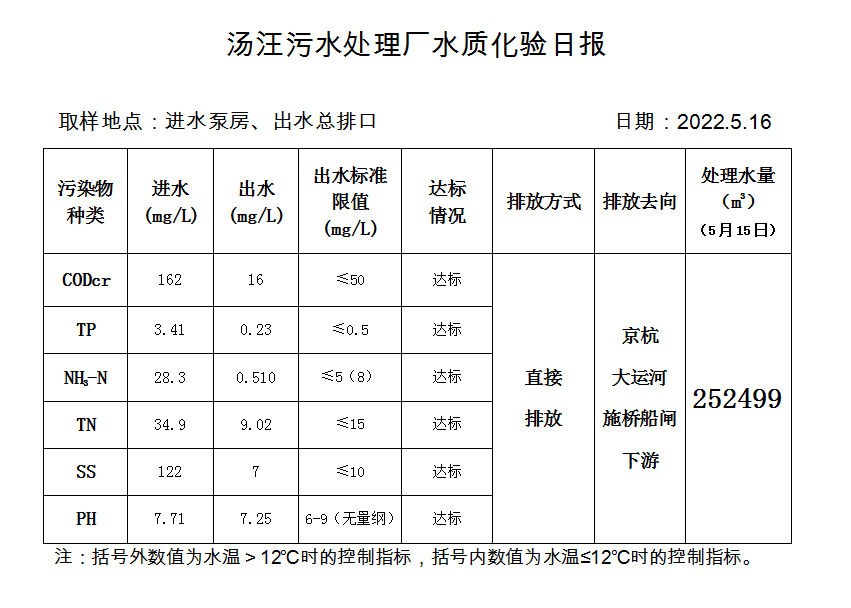 汤汪污水处理厂水质化验日报(2022.5.16)