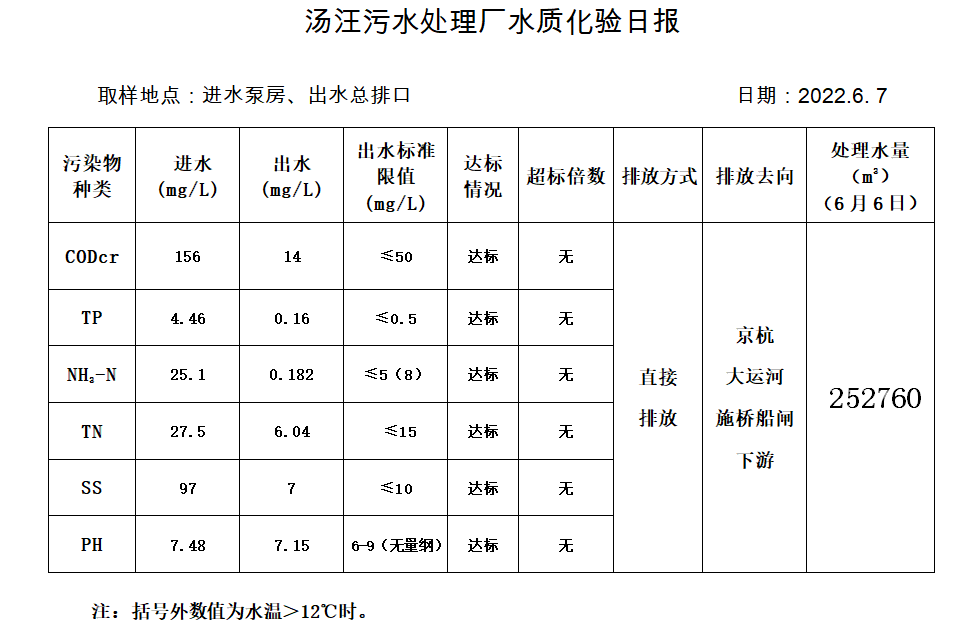 汤汪污水处理厂水质化验日报(2022.6.7)
