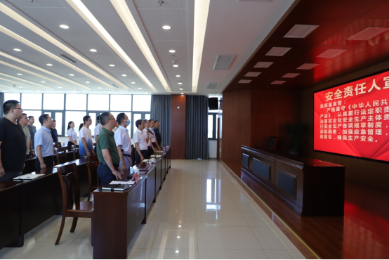 首先参会人员观看了生产安全重大事故警示教育片《红线》,通过一个个血淋淋的事故,警示我们安全生产容不得一丝丝麻痹,安全生产是底线,发展决不能以牺牲人的生命为代价这是一条不可逾越的红线。随后,公司党总支书记、董事长刘义忠带领全体参会人员进行了安全生产责任人宣誓。最后,刘义忠强调:一是要把安全生产这根弦绷的紧而又紧,戒除麻痹思想,不断提高安全意识。二是要把安全生产责任抓得实而再实,坚持“三管三必须”,按照“党政同责、一岗双责、齐抓共管、失职追责”的要求,切实加强对安全生产工作的组织领导,建立健全安全生产责任清单。 三是要把隐患排查治理抓得严而再严,常态化推进安全生产隐患排查治理,要坚持问题导向,持续开展安全生产隐患大排查大整治。