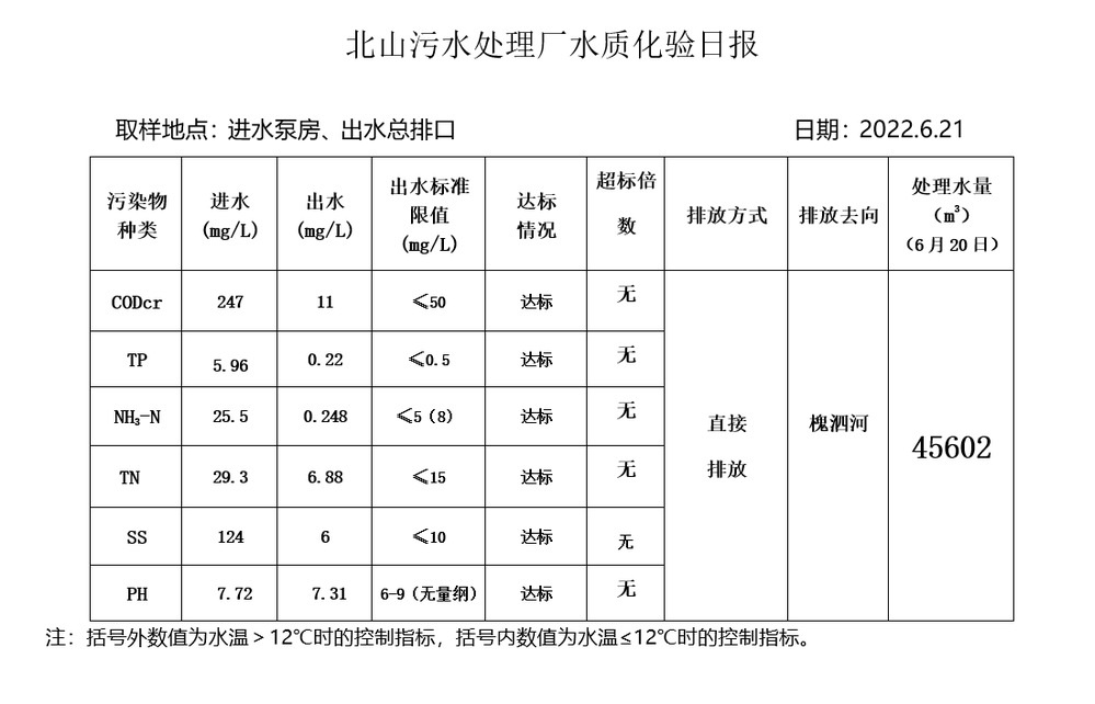 北山污水处理厂水质化验日报(2022.6.21)